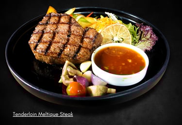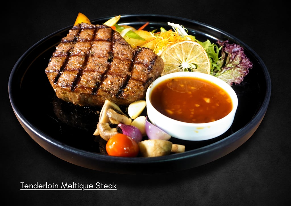 WAGYU MEALTIQUE STEAK SERVED WITH POTATO AND SALAD.